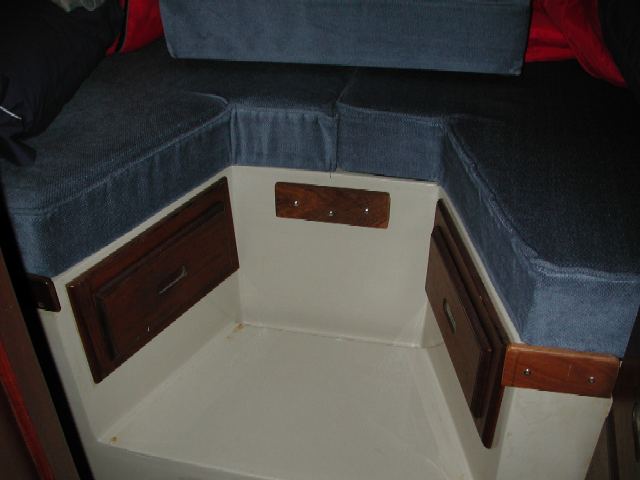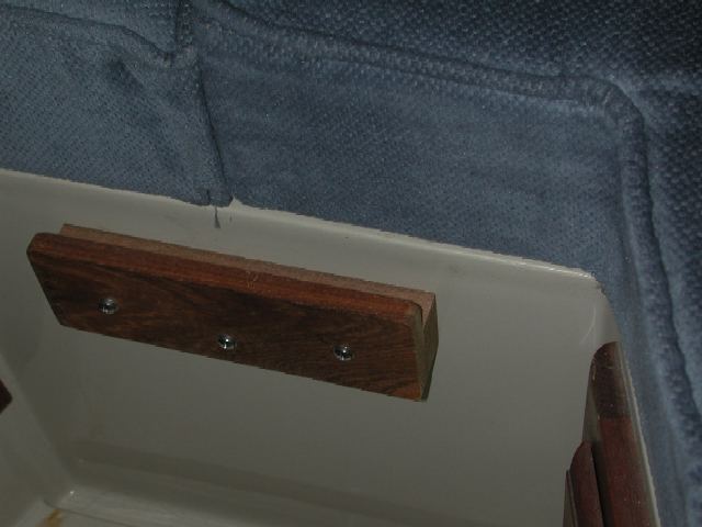 Our favorite place to sleep on Que Linda is the forward berth. However, it was very annoying, in the middle of the night, when the plug, which drops down to make a seat, would slide aft and drop down into the lower position. We solved this problem by bolting a cleat near the top of this seat well, which engages the wooden strip already screwed to the bottom of the plug.
